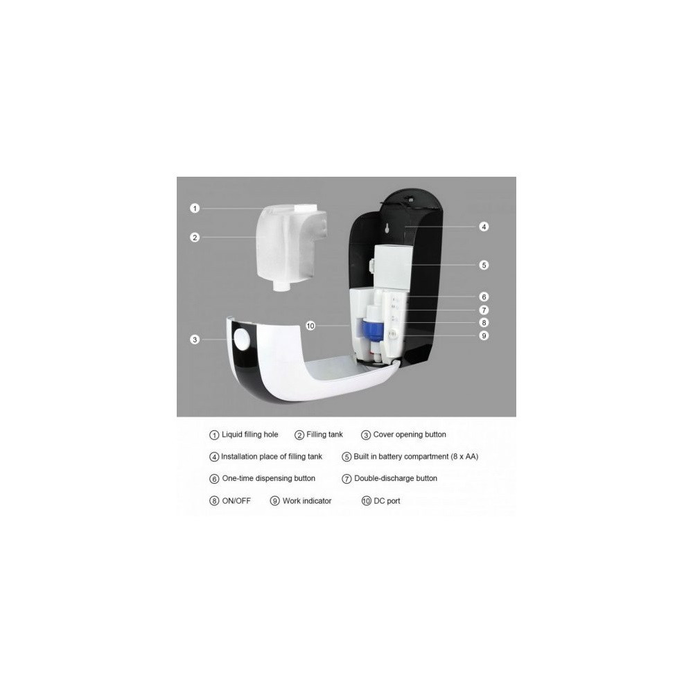 Szenzoros kézfertőtlenítő és folyékony szappan adagoló fali fehér-fekete 1000ml adapterrel, folyékony szappan és gél pumpával szerelve (spray pumpa külön vásárolható hozzá, víz állagú szer adagolásához szükséges!) Felhasználható: egészségügyi intézményekben, oktatási intézményekben, áruházakban, irodákban stb.