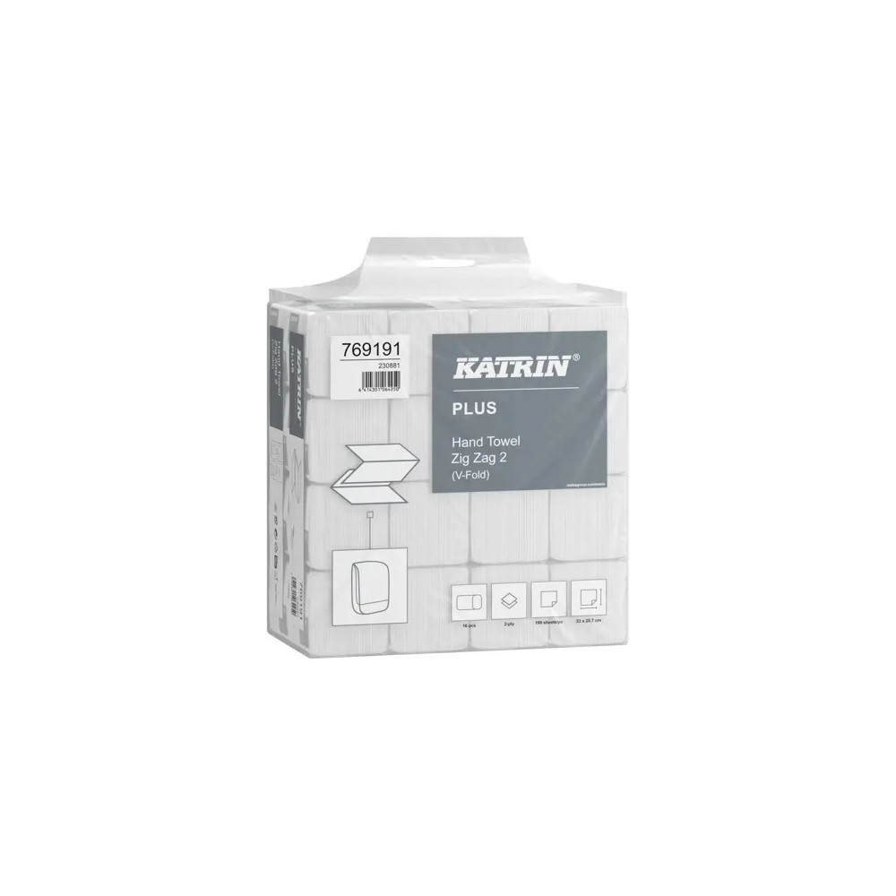 Kéztörlő 2 rétegű V hajtogatású 190 lap/cs 16 csomag/karton Katrin Plus Zig Zag 2 rétegű_769191 hófehér