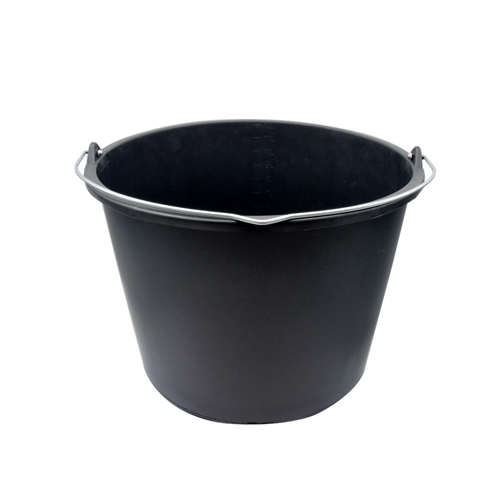 Vastag műanyagból készült, 12L-es vödör, fém fogantyúval. Erősített építési vödör.